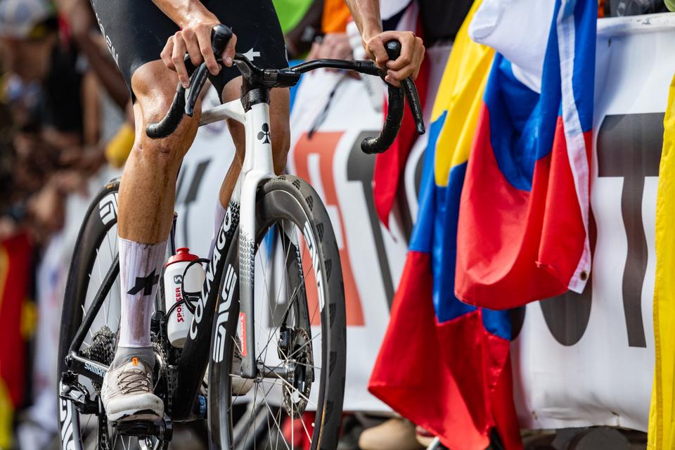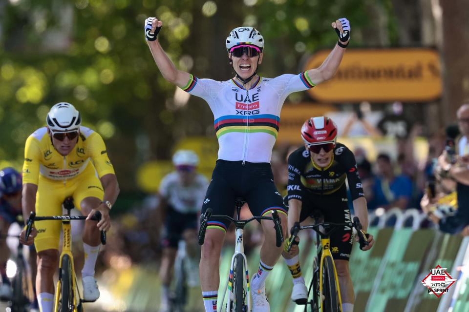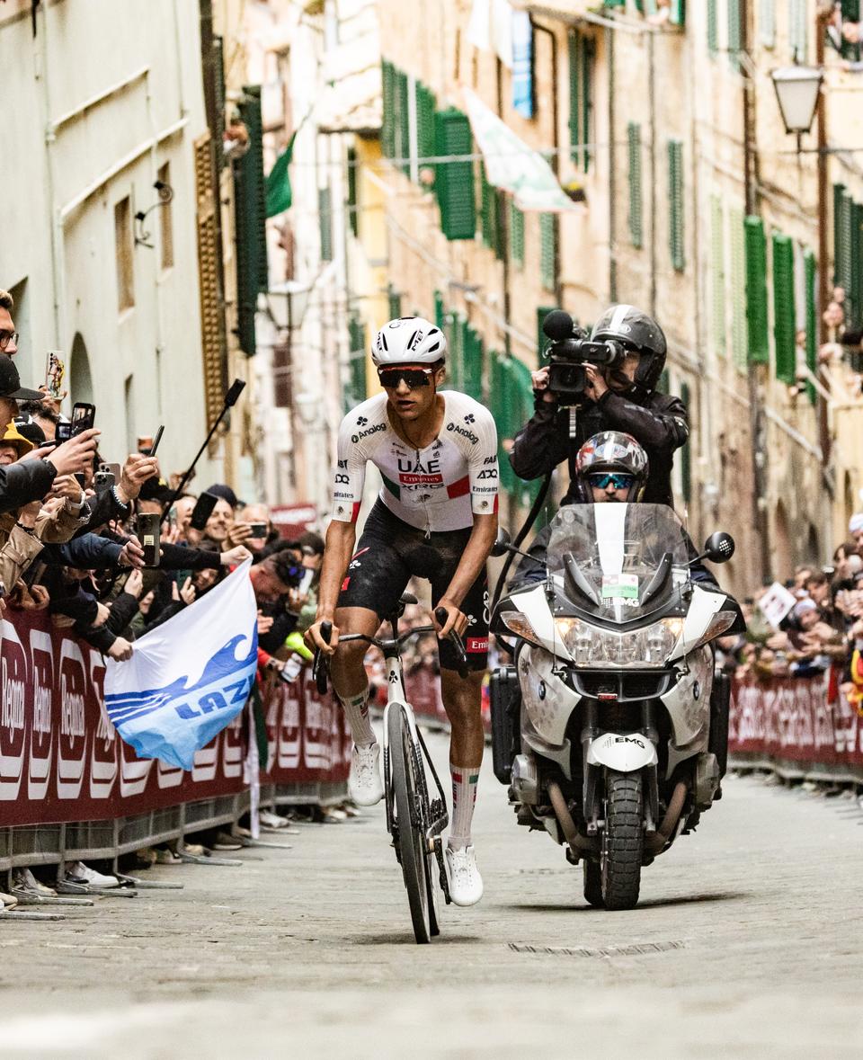 White becomes the canvas for the World Championship stripes, a tribute to the two world titles of Tadej Pogačar.